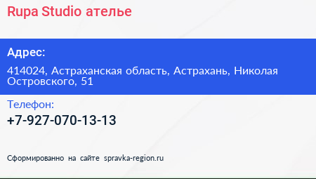 Rupa Studio, ателье по адресу 414024, Астраханская область, Астрахань, Николая Островского, 51 в дальнейшем Организация, размещена в следующих категориях: