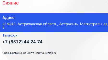 Сияние по адресу 414042, Астраханская область, Астрахань, Магистральная, 5 в дальнейшем Организация, размещена в следующих категориях: