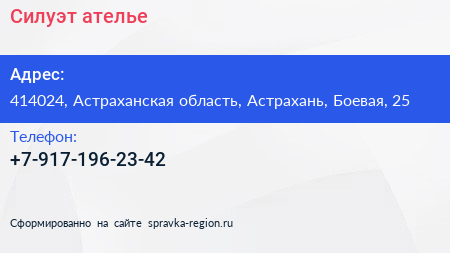 Силуэт, ателье по адресу 414024, Астраханская область, Астрахань, Боевая, 25 в дальнейшем Организация, размещена в следующих категориях: