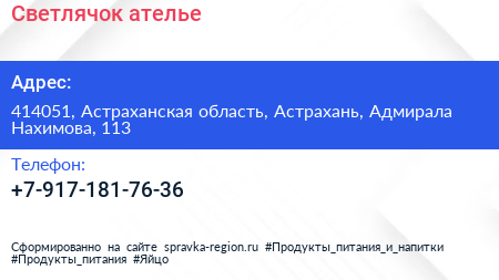 Светлячок, ателье по адресу 414051, Астраханская область, Астрахань, Адмирала Нахимова, 113 в дальнейшем Организация, размещена в следующих категориях: