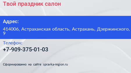 Твой праздник, салон по адресу 414006, Астраханская область, Астрахань, Дзержинского, 9 в дальнейшем Организация, размещена в следующих категориях: