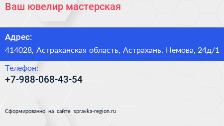 Ваш ювелир, мастерская по адресу 414028, Астраханская область, Астрахань, Немова, 24д/1 в дальнейшем Организация, размещена в следующих категориях: