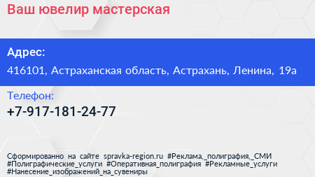 Ваш ювелир, мастерская по адресу 416101, Астраханская область, Астрахань, Ленина, 19а в дальнейшем Организация, размещена в следующих категориях:
