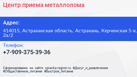 Центр приема металлолома по адресу 414015, Астраханская область, Астрахань, Керченская 5-я, 2а/2 в дальнейшем Организация, размещена в следующих категориях: