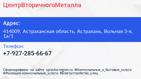 ЦентрВторичногоМеталла по адресу 414009, Астраханская область, Астрахань, Вольная 3-я, 1а/1 в дальнейшем Организация, размещена в следующих категориях:
