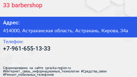 33 barbershop по адресу 414000, Астраханская область, Астрахань, Кирова, 34а в дальнейшем Организация, размещена в следующих категориях: