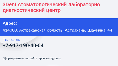 3Dent, стоматологический лабораторно-диагностический центр по адресу 414000, Астраханская область, Астрахань, Шаумяна, 44 в дальнейшем Организация, размещена в следующих категориях: