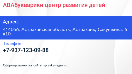 ABAбукварики, центр развития детей по адресу 414056, Астраханская область, Астрахань, Савушкина, 6 к10 в дальнейшем Организация, размещена в следующих категориях: