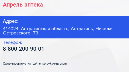 Апрель, аптека по адресу 414024, Астраханская область, Астрахань, Николая Островского, 73 в дальнейшем Организация, размещена в следующих категориях: