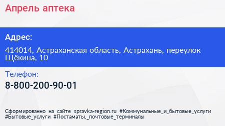 Апрель, аптека по адресу 414014, Астраханская область, Астрахань, переулок Щёкина, 10 в дальнейшем Организация, размещена в следующих категориях: