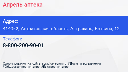Апрель, аптека по адресу 414052, Астраханская область, Астрахань, Ботвина, 12 в дальнейшем Организация, размещена в следующих категориях: