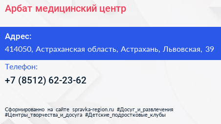 Арбат, медицинский центр по адресу 414050, Астраханская область, Астрахань, Львовская, 39 в дальнейшем Организация, размещена в следующих категориях: