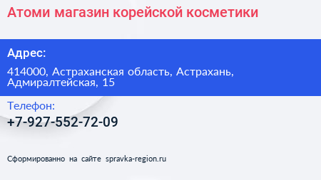 Атоми, магазин корейской косметики по адресу 414000, Астраханская область, Астрахань, Адмиралтейская, 15 в дальнейшем Организация, размещена в следующих категориях: