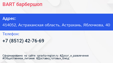 BART, барбершоп по адресу 414052, Астраханская область, Астрахань, Яблочкова, 40 в дальнейшем Организация, размещена в следующих категориях: