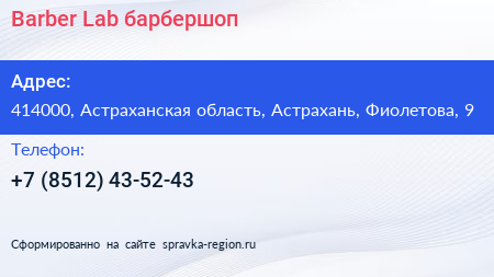 Barber Lab, барбершоп по адресу 414000, Астраханская область, Астрахань, Фиолетова, 9 в дальнейшем Организация, размещена в следующих категориях: