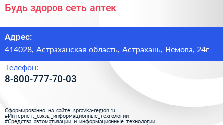 Будь здоров, сеть аптек по адресу 414028, Астраханская область, Астрахань, Немова, 24г в дальнейшем Организация, размещена в следующих категориях:
