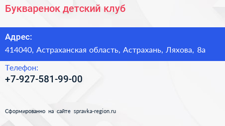 Букваренок, детский клуб по адресу 414040, Астраханская область, Астрахань, Ляхова, 8а в дальнейшем Организация, размещена в следующих категориях: