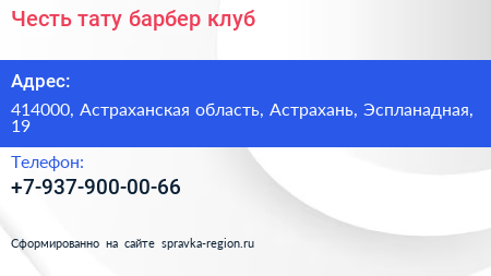Честь, тату-барбер клуб по адресу 414000, Астраханская область, Астрахань, Эспланадная, 19 в дальнейшем Организация, размещена в следующих категориях: