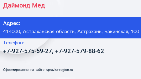 Даймонд-Мед по адресу 414000, Астраханская область, Астрахань, Бакинская, 100 в дальнейшем Организация, размещена в следующих категориях: