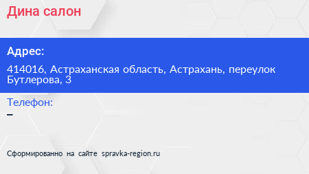 Дина, салон по адресу 414016, Астраханская область, Астрахань, переулок Бутлерова, 3 в дальнейшем Организация, размещена в следующих категориях: