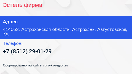 Эстель, фирма по адресу 414052, Астраханская область, Астрахань, Августовская, 7д в дальнейшем Организация, размещена в следующих категориях: