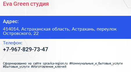 Eva Green, студия по адресу 414014, Астраханская область, Астрахань, переулок Островского, 22 в дальнейшем Организация, размещена в следующих категориях: