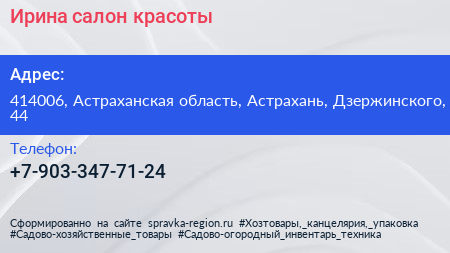 Ирина, салон красоты по адресу 414006, Астраханская область, Астрахань, Дзержинского, 44 в дальнейшем Организация, размещена в следующих категориях: