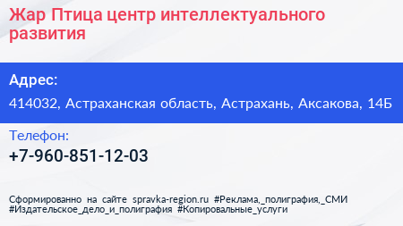 Жар-Птица, центр интеллектуального развития по адресу 414032, Астраханская область, Астрахань, Аксакова, 14Б в дальнейшем Организация, размещена в следующих категориях: