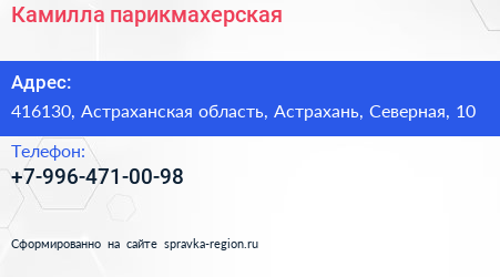 Камилла, парикмахерская по адресу 416130, Астраханская область, Астрахань, Северная, 10 в дальнейшем Организация, размещена в следующих категориях: