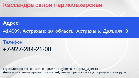 Кассандра, салон-парикмахерская по адресу 414009, Астраханская область, Астрахань, Дальняя, 3 в дальнейшем Организация, размещена в следующих категориях: