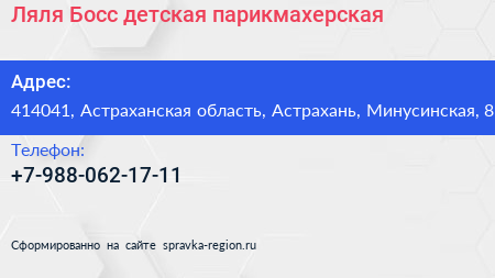 Ляля Босс, детская парикмахерская по адресу 414041, Астраханская область, Астрахань, Минусинская, 8 в дальнейшем Организация, размещена в следующих категориях: