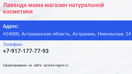 Лаванда-мама, магазин натуральной косметики по адресу 414000, Астраханская область, Астрахань, Никольская, 14 в дальнейшем Организация, размещена в следующих категориях: