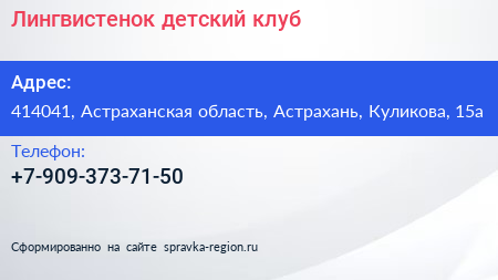 Лингвистенок, детский клуб по адресу 414041, Астраханская область, Астрахань, Куликова, 15а в дальнейшем Организация, размещена в следующих категориях: