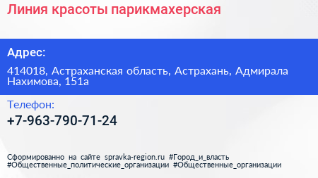 Линия красоты, парикмахерская по адресу 414018, Астраханская область, Астрахань, Адмирала Нахимова, 151а в дальнейшем Организация, размещена в следующих категориях: