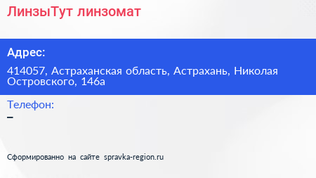 ЛинзыТут, линзомат по адресу 414057, Астраханская область, Астрахань, Николая Островского, 146а в дальнейшем Организация, размещена в следующих категориях: