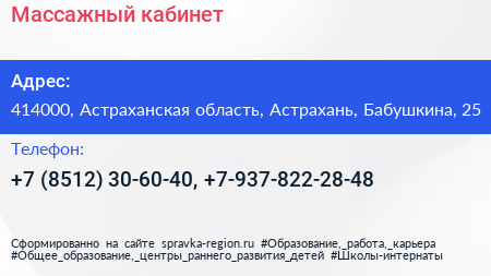 Массажный кабинет по адресу 414000, Астраханская область, Астрахань, Бабушкина, 25 в дальнейшем Организация, размещена в следующих категориях: