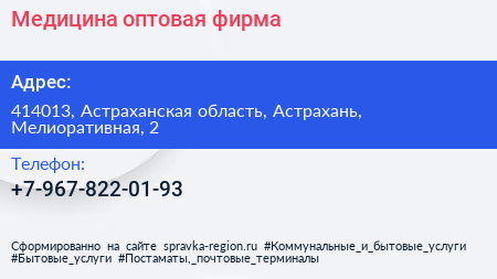 Медицина, оптовая фирма по адресу 414013, Астраханская область, Астрахань, Мелиоративная, 2 в дальнейшем Организация, размещена в следующих категориях: