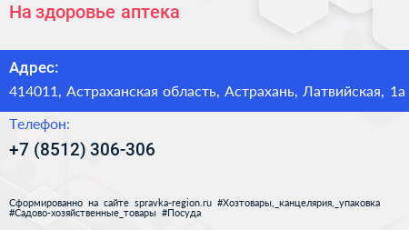 На здоровье, аптека по адресу 414011, Астраханская область, Астрахань, Латвийская, 1а в дальнейшем Организация, размещена в следующих категориях: