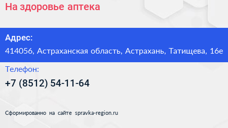 На здоровье, аптека по адресу 414056, Астраханская область, Астрахань, Татищева, 16е в дальнейшем Организация, размещена в следующих категориях: