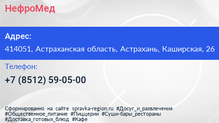НефроМед по адресу 414051, Астраханская область, Астрахань, Каширская, 26 в дальнейшем Организация, размещена в следующих категориях: