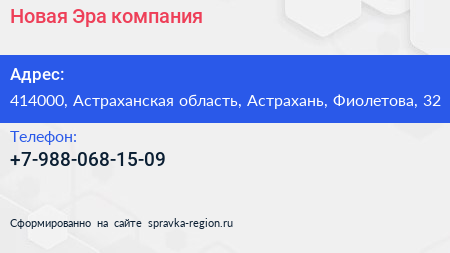 Новая Эра, компания по адресу 414000, Астраханская область, Астрахань, Фиолетова, 32 в дальнейшем Организация, размещена в следующих категориях: