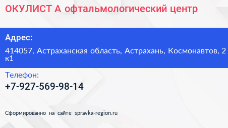 ОКУЛИСТ А, офтальмологический центр по адресу 414057, Астраханская область, Астрахань, Космонавтов, 2 к1 в дальнейшем Организация, размещена в следующих категориях: