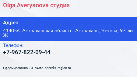 Olga Averyanova, студия по адресу 414056, Астраханская область, Астрахань, Чехова, 97 лит Ж в дальнейшем Организация, размещена в следующих категориях: