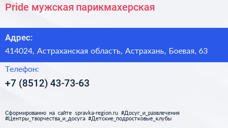 Pride, мужская парикмахерская по адресу 414024, Астраханская область, Астрахань, Боевая, 63 в дальнейшем Организация, размещена в следующих категориях: