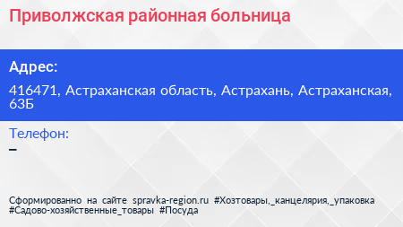 Приволжская районная больница по адресу 416471, Астраханская область, Астрахань, Астраханская, 63Б в дальнейшем Организация, размещена в следующих категориях: