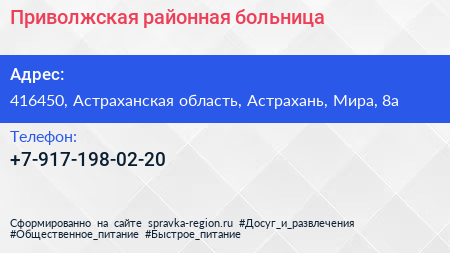 Приволжская районная больница по адресу 416450, Астраханская область, Астрахань, Мира, 8а в дальнейшем Организация, размещена в следующих категориях: