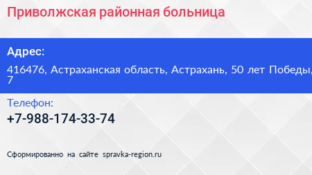 Приволжская районная больница по адресу 416476, Астраханская область, Астрахань, 50 лет Победы, 7 в дальнейшем Организация, размещена в следующих категориях: