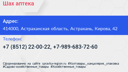 Шах, аптека по адресу 414000, Астраханская область, Астрахань, Кирова, 42 в дальнейшем Организация, размещена в следующих категориях:
