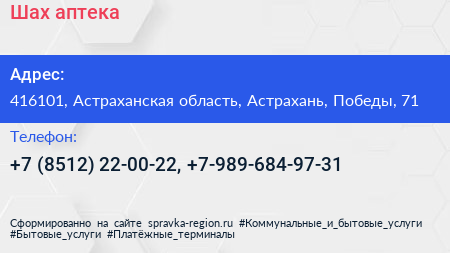 Шах, аптека по адресу 416101, Астраханская область, Астрахань, Победы, 71 в дальнейшем Организация, размещена в следующих категориях: