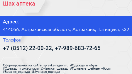 Шах, аптека по адресу 414056, Астраханская область, Астрахань, Татищева, к32 в дальнейшем Организация, размещена в следующих категориях: